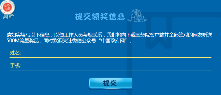 刚刚看到某群友发的国务院送流量的活动~ 传送门:http://app.www.gov.cn/govdata/html/cst/index.html 附带答案JS:http://app.www.gov.cn/govdata/html/cst...
